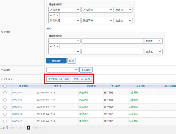 「受注明細リスト出力」、「受注リスト出力」をクリックして出力します。