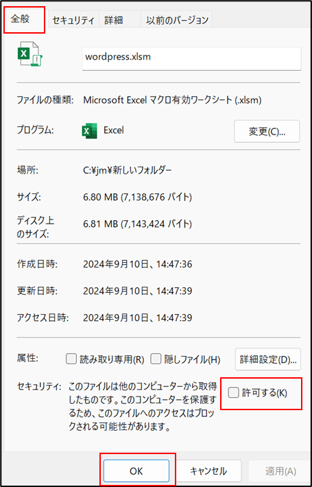「全般」タブの一番したの「セキュリティ」で「許可する」をチェックします。