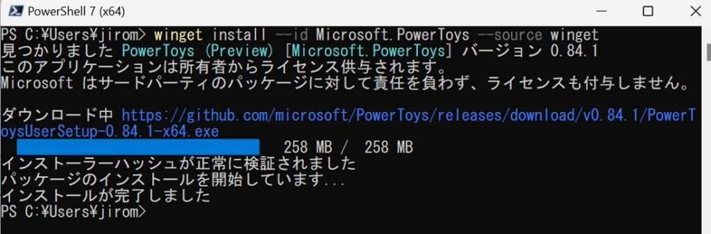「PowerShell」を使用して「PowerToys」をインストールします。