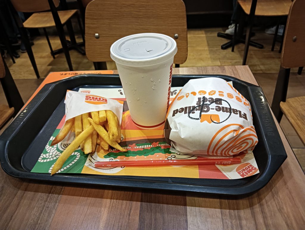 今日は大月見バーガー。13時過ぎだけど混んでる。みんな遅めの昼食か。今日は朝から業務スーパーへ買い出しにいって疲れた。大月見はベーコンにパインまで入っていてうまい。パインは賛否だろうけど僕はパイン好きなんだよね。スモーキーなベーコンにパインと卵の組み合わせは良いでふす。
