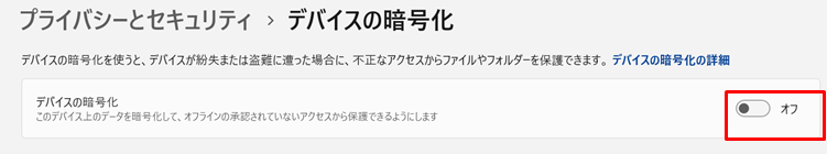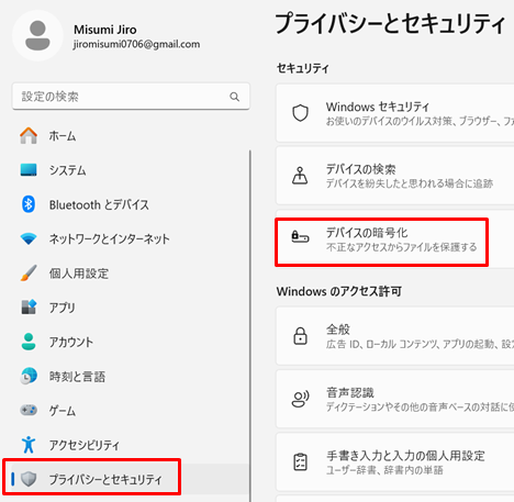 設定より、「プライバシーとセキュリティ→デバイスの暗号化」を選択します。